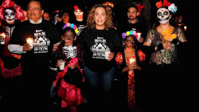 En el primer día del Mictlán, el Alcalde Andrés Mijes, acompañado de su esposa e hijas, encabezó una procesión en el Parque Lineal Las Torres para recordar a los seres queridos que se han ido.