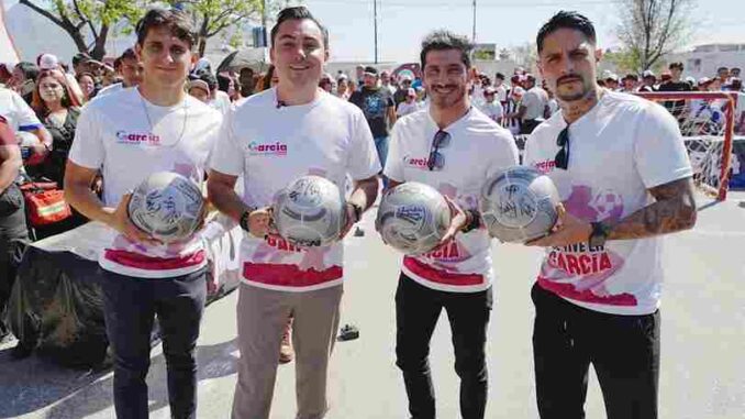 El alcalde de García, Manuel Guerra Cavazos, acompañado del exjugador del Club Tigres, Damián Álvarez, y del exfutbolista de Rayados de Monterrey y Tigres, Edgar “Tepa” Solís, dio la patada inicial al “Mundialito Callejero de la Gente”, torneo en el que participan 64 equipos provenientes de distintas colonias del municipio, quienes competirán por atractivos premios en una iniciativa que busca impulsar el deporte, fortalecer la sana convivencia y fomentar la participación de las y los jóvenes de García.