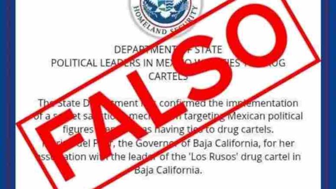 Las embajadas de EUA en México y de México en Estados Unidos lanzaron este martes un comunicado donde desmintieron que el Departamento de Estado de Estados Unidos haya sancionado a gobernadores de México por supuestos vínculos con cárteles, como circuló falsamente en redes sociales.