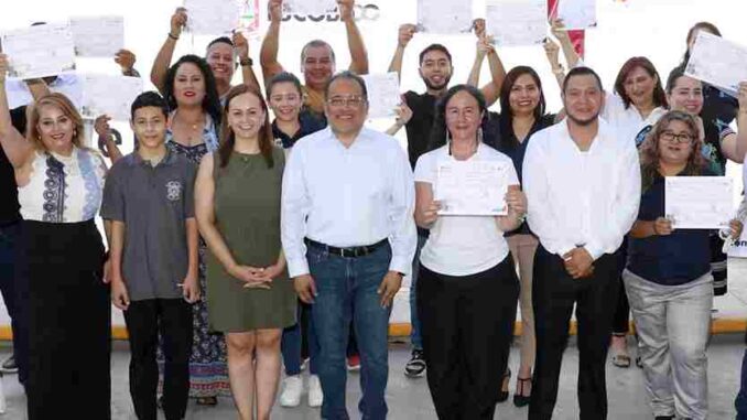 El Alcalde Andrés Mijes, en compañía de Daniel Flores, Secretario de Bienestar, además de Sandra Rivera, coordinadora modelo ISSOK entregaron constancias a los docentes de la Secundaria Técnica #87 “Mariano Arista” de la colonia Fernando Amilpa, quienes concluyeron con éxito el primer nivel.