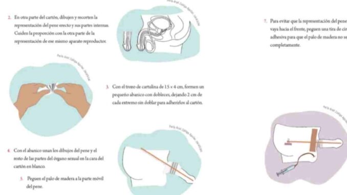 Mientras que en el libro Proyectos de aula, del mismo grado de primaria, a niños y niñas se les enseña una novedosa manualidad; construir un “pene erecto” (con un palo de madera, cartón y una pequeña manguera) que termine eyaculando, para ello los menores deben utilizar agua con pintura blanca para emular el color lechoso del semen.