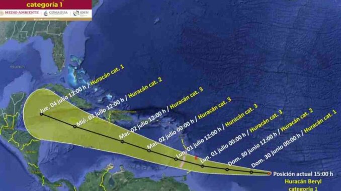 Beryl se convirtió este sábado rápidamente en huracán categoría 1 a las 15 hrs., aunque aún está lejos del territorio nacional ya comienzan a llegar los vientos y nubosidad. Se acercará Quintana Roo como huracán categoría 1 el jueves 4 de junio, además hay otros fenómenos meteorológicos que dejarán intensas lluvias en gran parte de México.
