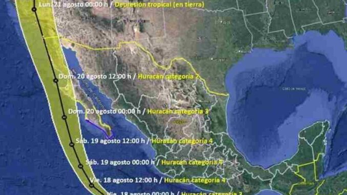 El SMN prevé que Hilary evolucione a huracán categoría 4 el próximo viernes 18 de agosto y se mantenga con esa fuerza hasta el sábado 19.