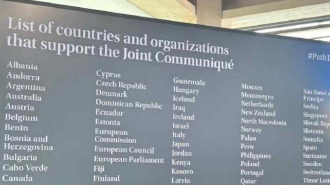 El comisario de la Rada Suprema de Ucrania para los Derechos Humanos, Dimitro Lubinets, ha divulgado una foto de la sesión final del evento donde figuran los 80 países que sí han firmado la declaración, entre ellos Estados Unidos, Reino Unido, la Comisión Europea, Italia, Portugal y España, de acuerdo con la imagen publicada en su cuenta de Telegram.