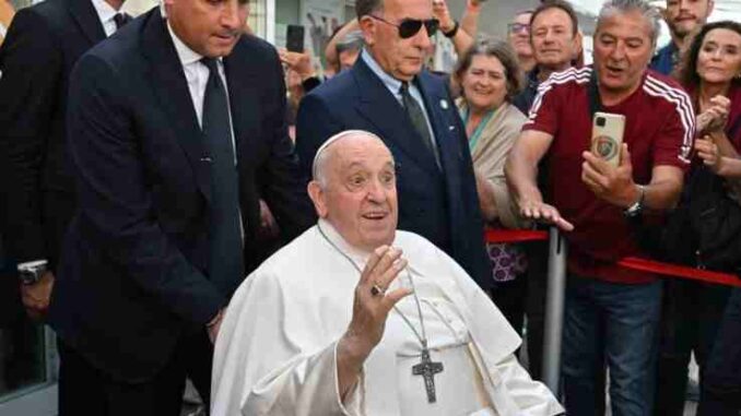 El jesuita argentino salió sonriendo en silla de ruedas del Policlínico Gemelli, en cuyas puertas era esperado por una multitud de feligreses y periodistas.