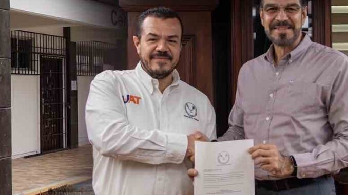 Durante el acto protocolario desarrollado en la oficina rectoral, el contador Guillermo Mendoza Cavazos felicitó al funcionario y lo exhortó a dar su máximo esfuerzo en el cumplimiento de las metas institucionales de la UAT.
