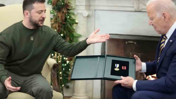 Zelenski entregó a Biden una condecoración de un capitán de las Fuerzas Armadas ucranianas y dijo que quería que el mandatario estadounidense tuviera ese reconocimiento.